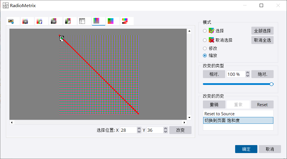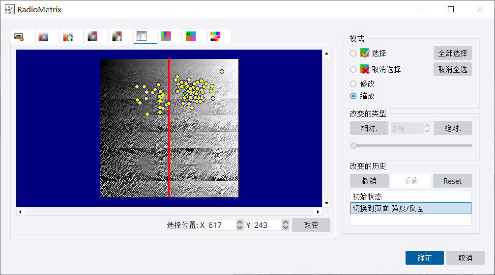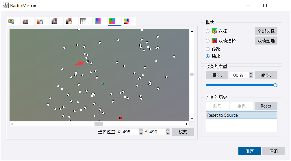 用缩放工具,拉框进行缩放,然后就能看到一个蓝色的点,这个点就是代表参考片。黄色点是需要调色的影像。绿色点是所有影像的色彩均值。