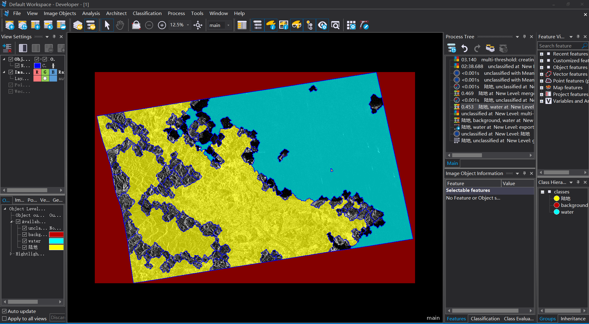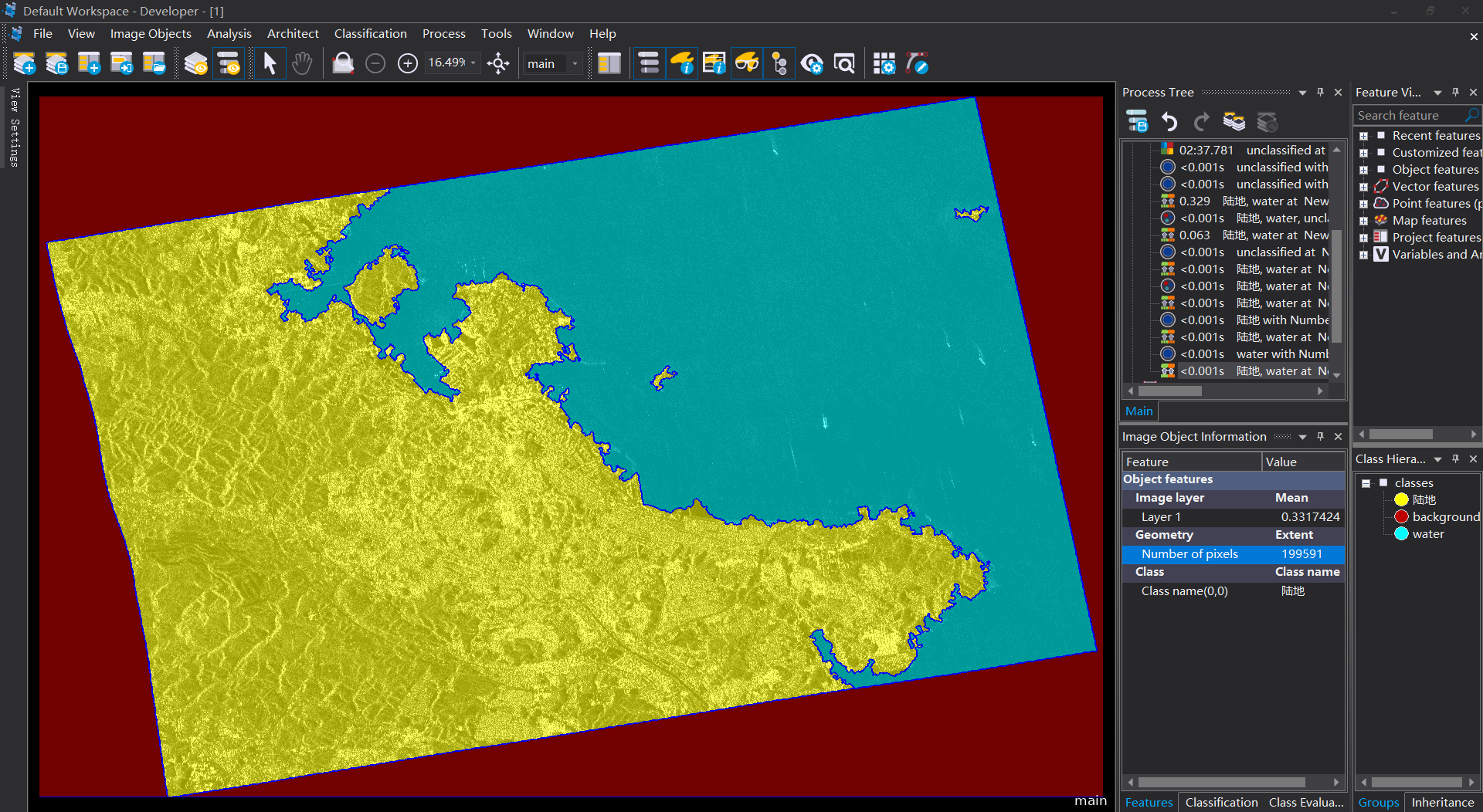 10 进行“陆地”和“水域”与“未分类”之间进行一个简单的分类去除;再将“陆地”中面积小于5000pixel的土块分到“水域”中/合并;将“水域”中面积小于5000的土块分到“陆地”中/合并